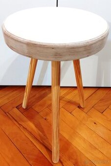 Prodám květinový stolek na trojnožce, který je 47cm vysoký a vypadá jako ševcovský verpánek. Průměr kruhové plochy z dýhované překližky tloušťky 40mm je 29cm . Nohy mají průměr tyčky z borovice je 25mm. Hmotnost cca 2,5kg. Stolek je jemně obroušen a není natřen (možnost natření, namoření či napuštění dle vlastní představy). Stolek je dostatečně pevný a může na něm sedět i dospělá osoba.
