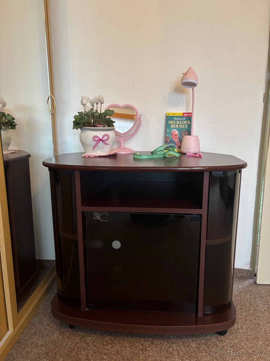 Zdravím, nabízím ke koupi televizní stolek. - barva: mahagon - na kolečkách-> bez vady - skleněná otevírací dvířka -> nahoře je kousek skla uštíplí, vyřešit to lze zalepením lepidlem na sklo - díry na kabely a na provzdušnění - na cene se muzeme domluvit - deska na hoře je nepoškozena - moc rada Vám dopošlu bližší informace a popřípadě rozměry