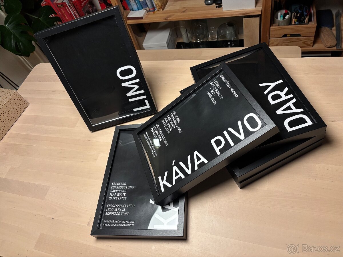 6x 21x30cm - černý, bez pasparty 2x 30x40cm - černý, bez pasparty Možné nechat i s grafikou uvnitř, černý podklad s bílým textem. Nápisy: malé(káva, kuřáci, pikador, dary, limo, káva+ pivo) větší (drinky, děti), možno poskytnout i další nápisy v podobě tiskových dat. Vhodné na oslavu, nebo svatbu. Původní cena: malý 119,- ks / větší 169,- ks Nyní všechny za 450,- Možnost prodat i samostatně
