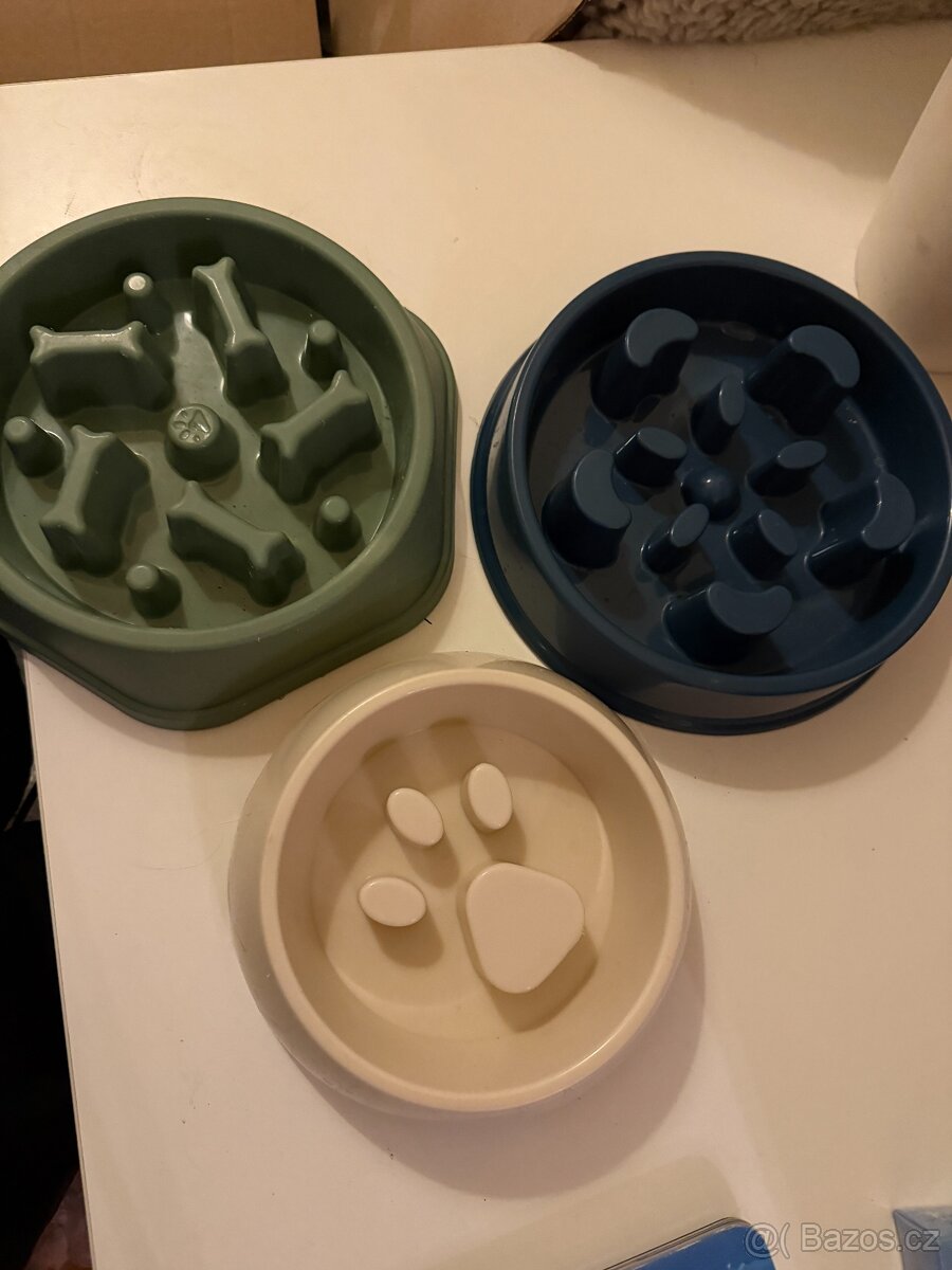 Proti hltací miska, která díky svému tvaru zajistí, že bude mít pejsek větší práci dostat se k jídlu. Máme tři nové dvě jsou jedna velikost a jedna je menší. Váš pejsek nepřestává hltat potravu a bojíte se, aby díky tomu neměl trávicí nebo jiné obtíže? Příčin hltání může být mnoho, ale pomoci může proti hltací miska, která díky svému tvaru zajistí, že bude mít pejsek větší práci dostat se k jídlu. Proti hltací miska zajistí, aby pejsek potravu nehltal. Misky jsou nové nepoužité. Zvýšené plastové části uvnitř misky zabraňují hltání potravy, tím dochází k zabránění nadýmání a dalším zažívacím obtížím. Misku lze použít na mokré i suché krmivo. Snadná údržba, misku lze snadno omýt vodou. Proti hltací miska - zabraňuje hltání - vhodná na suché i mokré krmivo - 4 cvočky zabraňující klouzání po podlaze - snadná údržba větší 19 cm- 159 Kč, menší 14 cm- 99 Kč zasílám zásilkovnou
