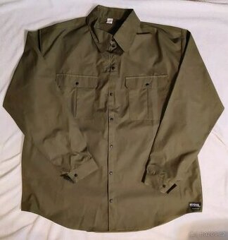 Prodávám košili od britské firmy Hilltrek, model Kintail, utkanou z velmi dlouhých vláken značkové bavlny "Ventile". Větruodolný, maximálně prodyšný, částečně nepromokavý materiál. Barva olivová, zelená. Košile se zapíná na cvoky (patentky) černé barvy, dvě kapsy a konce rukávů jsou také na cvoky. Nadměrná velikost 3XL - rozměry: šířka přes prsa - 2x77 cm, délka zad - 98 cm, délka rukávu měřená od krku - 94 cm. Košile je používaná, ve skvělém stavu, jako nová.