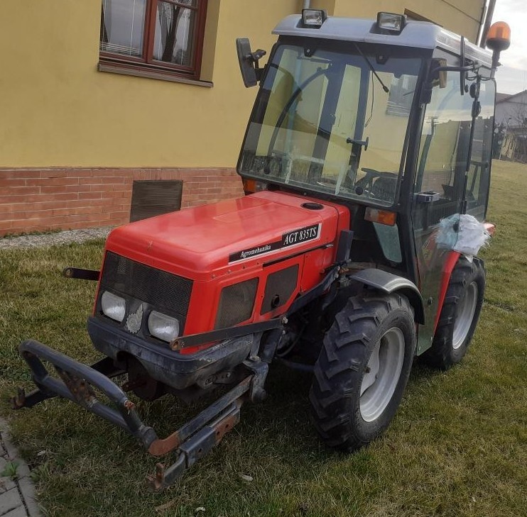 Prodám nekloubový malotraktor AGT 835TS. Chybí zadní sklo a pant dveří. Částečné napadení korozí. RV: 2016, doklady na přihlášení. Přední hydraulika. Přepravní rychlost až 25 km/h. Motor Lombardini, 35 koní. Vývodová hřídel 540/1000 ot. Po dohodě přivezu.