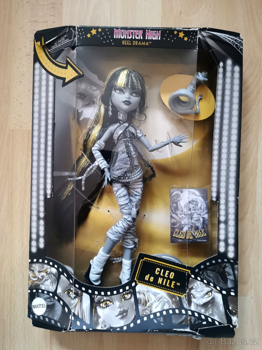 Reel Drama Cle de Nile Mattel Krabice je otevřená a hodně poničená, pomačkaná, potrhaná a zalepená izolepou! Panenka je stále přidělaná ke kartonu. Včetně plakátku, ten je trochu pomačkaný.