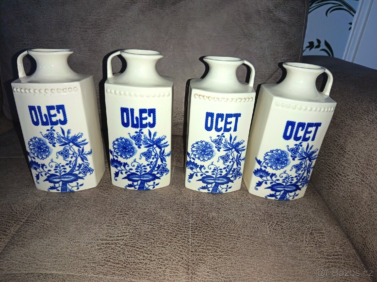 Nabízím čtyři keramické džbány na ocet a olej. Keramo Kožlany r.1951+ Výška 20 cm Šířka 9 cm Hloubka 9 cm Bez poškození,bez oťuku Za všechny 4 kusy