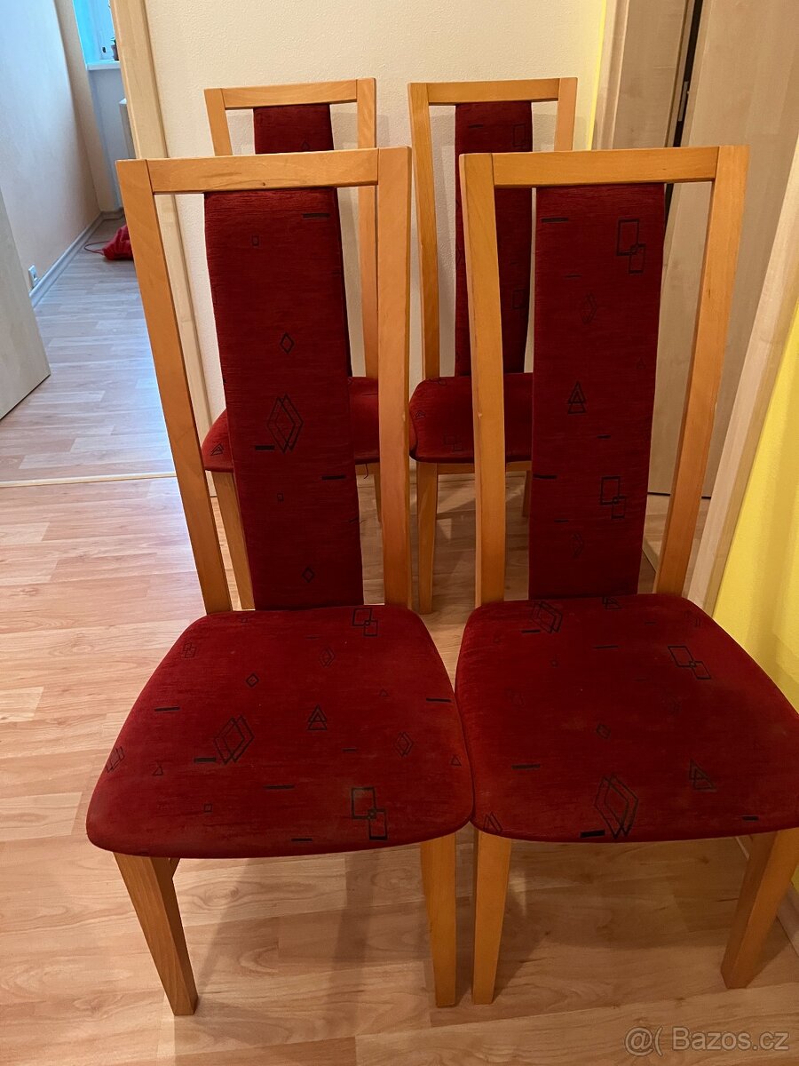 Prodám 4 dřevěné židle s červeným potahem. Židle nesou známky používání, jsou velmi dobrém stavu, stále pevné a stabilní (neviklou se). Cena je za komplet, vyzvednutí osobní.