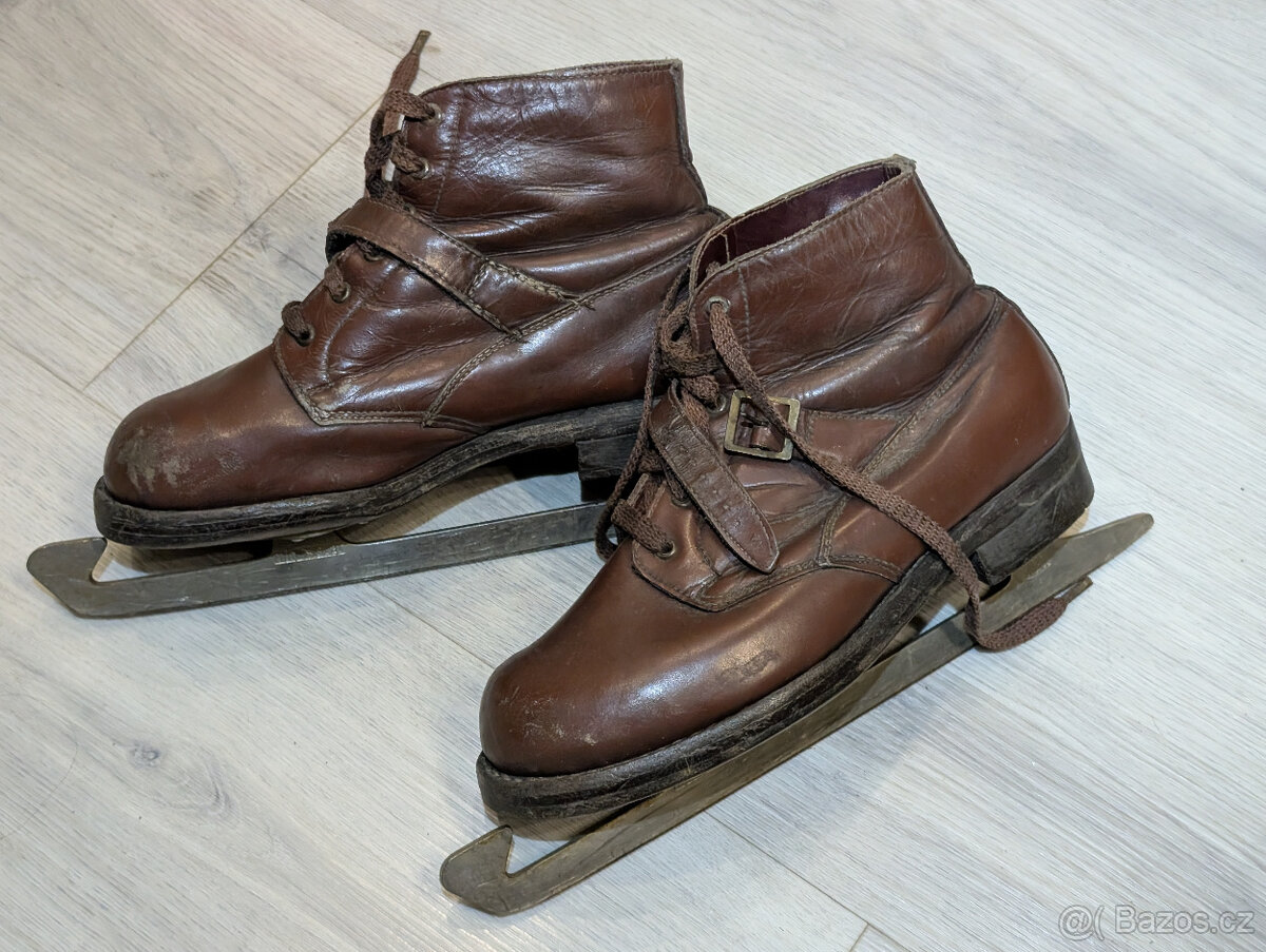 Cena: Nabídněte. Pár hnědých kožených bruslí na led. Jako retro dekorace. Vel. 21-23, Kovopol. Osobní vyzvednutí v Liberci nebo poštovné 100 Kč předem.