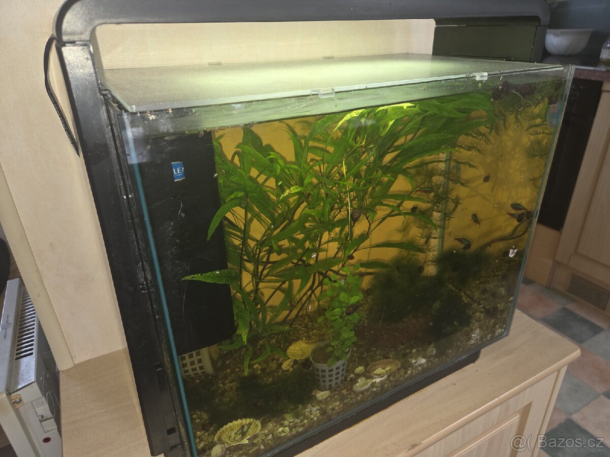Cca 35 l. Má filtraci i osvětlení. Rybičky i rostliny uvnitř. Volat.