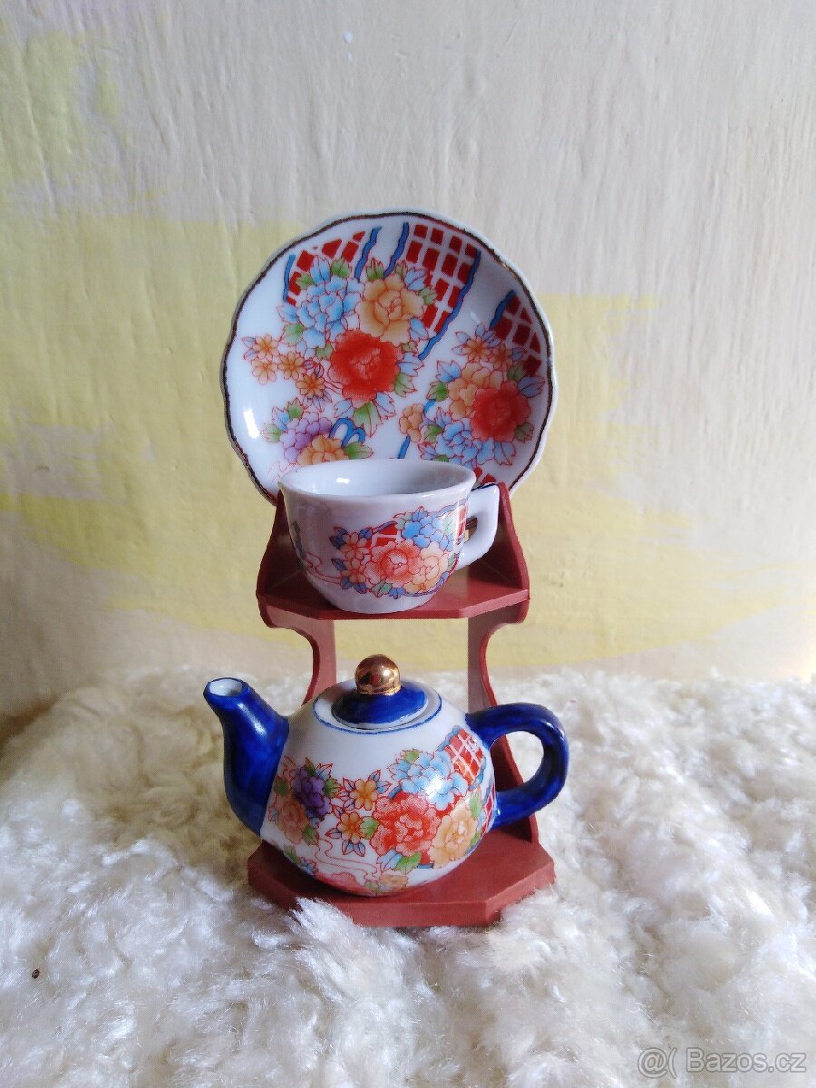 Prodám hrneček s podšálkem a konvicí pro dětské hraní. Výška na stojanu 16 cm, šířka talířku 8,5 cm, konvice 8 cm,průměr hrnečku 4,5 cm.
