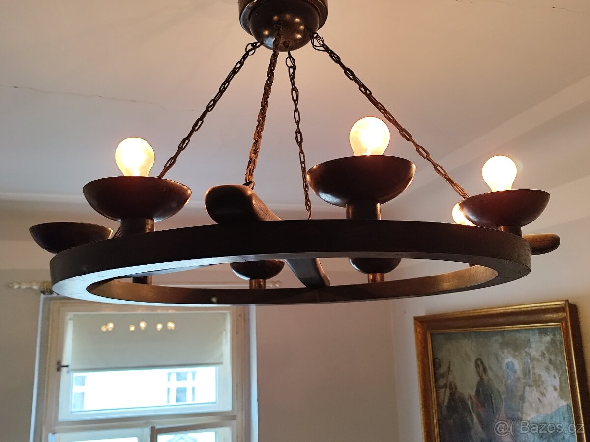 Nabízím starožitný, dřevěný, kruhový lustr. Průměr kruhu je 100 cm. Je ve velmi dobrém stavu. Plně funkční.