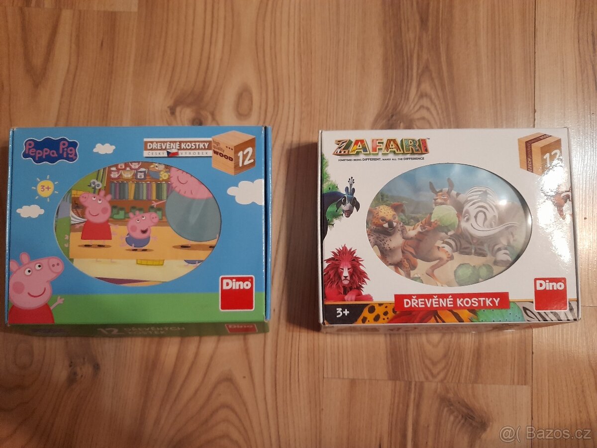 Dřevěné kostky Prasátko Peppa a Zafari, hrané. Uvedená cena je za jedno balení.