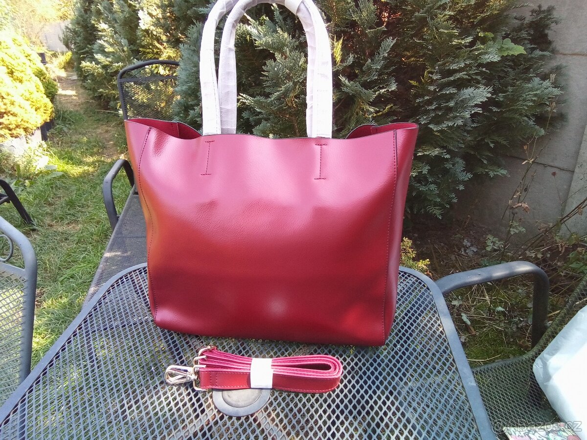 Vínová kožená kabelka s připínacim crossbody popruhem. Kabelka je nová,nikdy nenošena ze zrušeného e-shopu. Rozměry- šířka 32 cm,výška 30 cm a hloubka 12 cm. Kování je ve zlaté barvě. Uvnitř kabelky je velká kapsa na zip a 2 kovové patentky,které lze odepnout. Uvnitř kabelky je další 1 malá kapsa na zip a 2 malé kapsičky na drobnosti. Délka uší přes rameno je 45 cm.