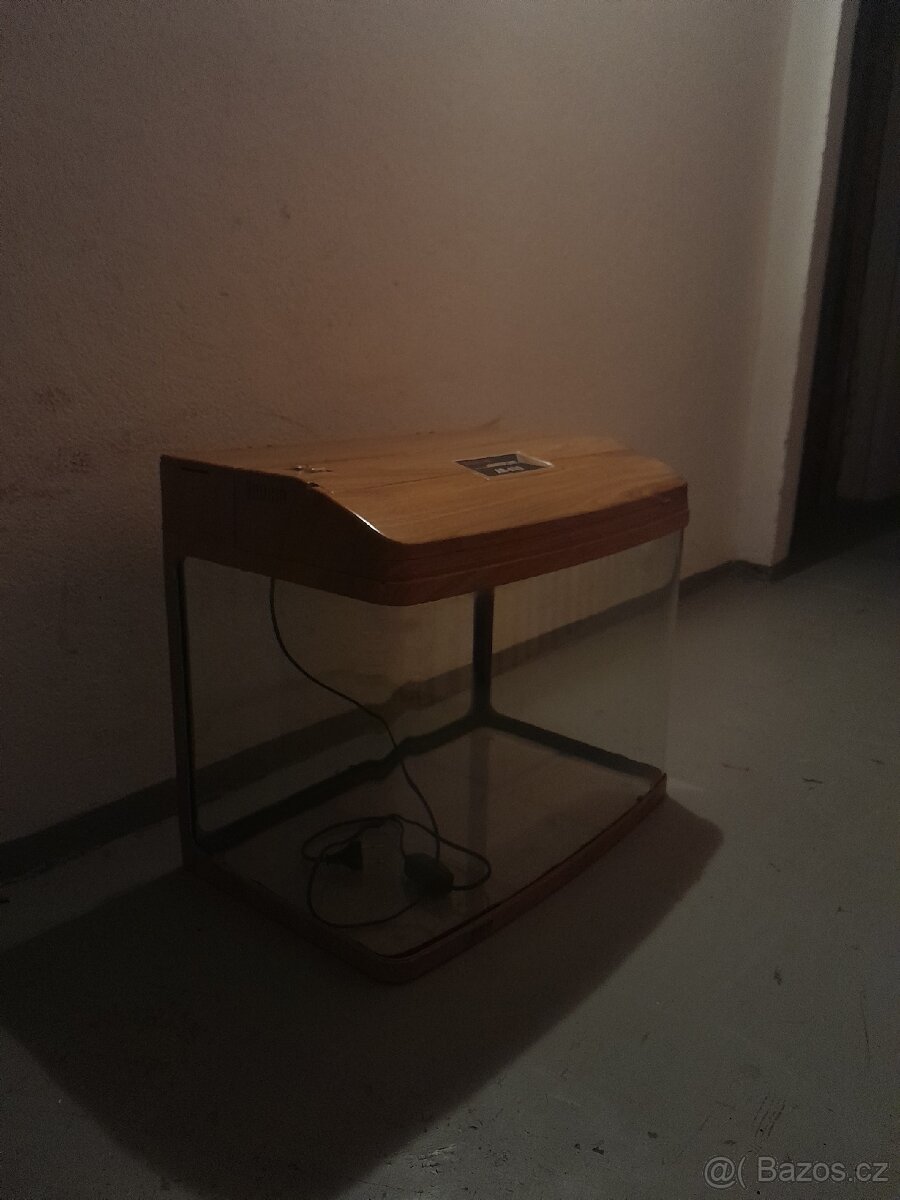 Mírně vyboulené akvarium v hnědém rámu, s vestavěnou filtrací a zářivkou. O rozměrech: Délka 61cm Šířka 38cm Hloubka bez výka cca 40cm