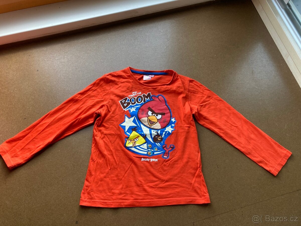 MOŽNÝ OSOBNÍ ODBĚR BRNO NEBO LIPŮVKA Oranžové tričko s dlouhými rukávy a obrázkem Angry Birds. Hezké, bez vad. Rozměry: délka rukávů od výstřihu 54 cm, délka 50 cm, šířka 40 cm Velikost: 128