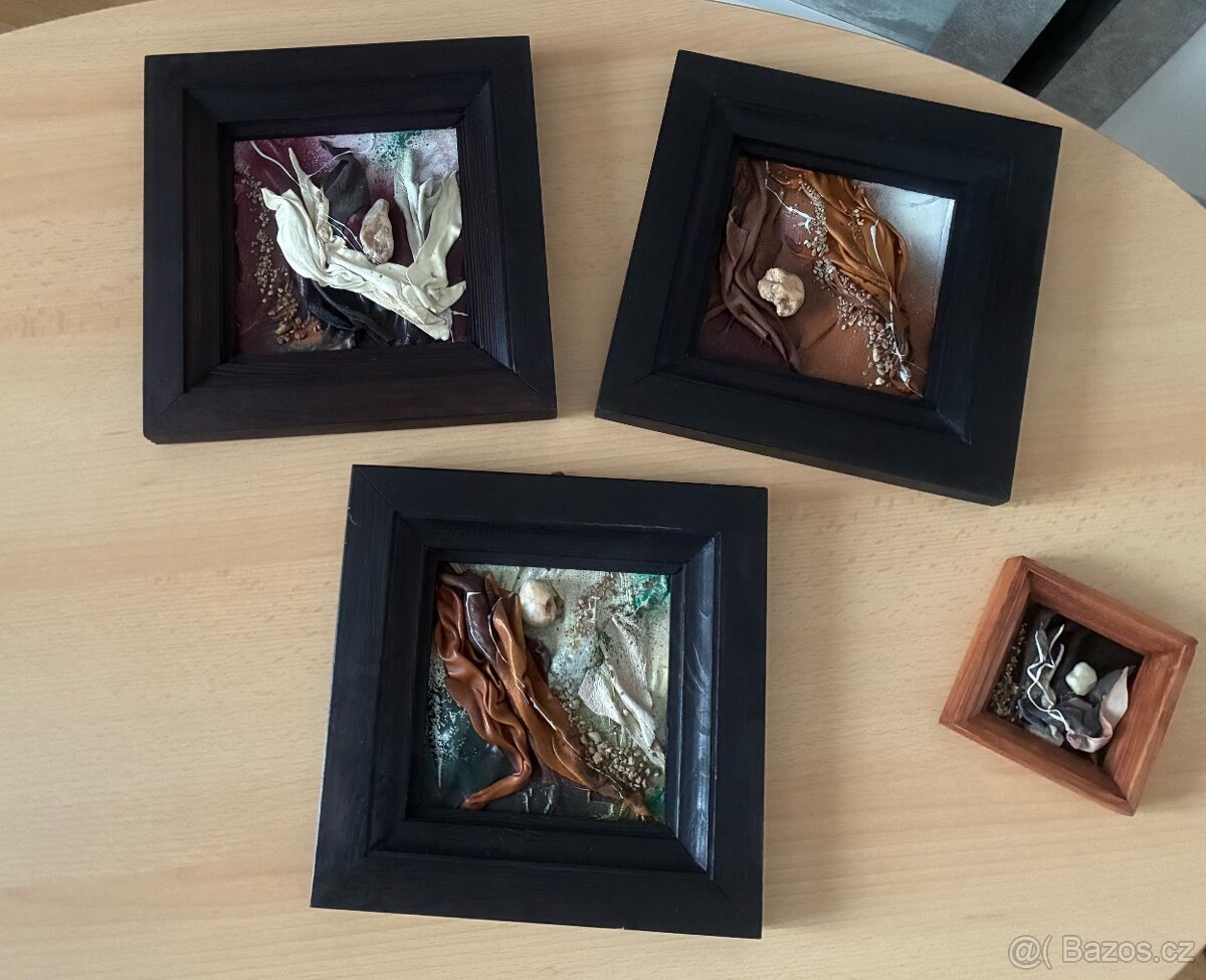 Nabízím pěkné, ručně vyrobené obrázky. v 3D. 3 větší (21x21 cm), 1 malý (9x9 cm). Jedná se o kombinaci kůže,kamene,textilie,korálků atd. Pošlu Balíkovnou, Zásilkovnou, popř. k vyzvednutí na Praze 9. Cena uvedena za celý komplet.