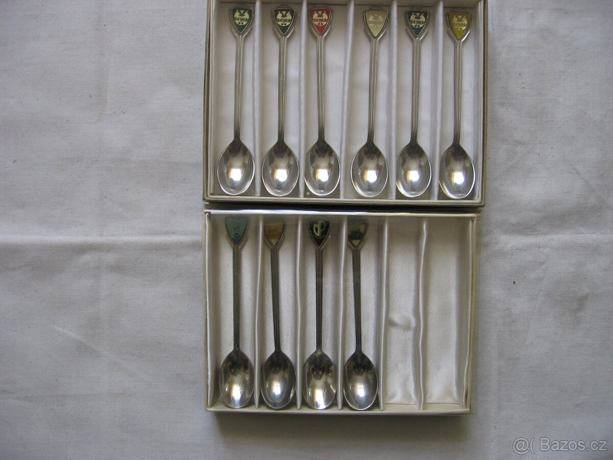 Cena: V textu. Sada lžiček Rekord - původní krabička, kompletní sada Kč 199,-.. lžička- Bratislava 2x - zelená, žlutá,, Karlovy Vary - zelená, Domácí potřeby Padrubice - černá, cena za ks 39,-, k tomu původní krabička