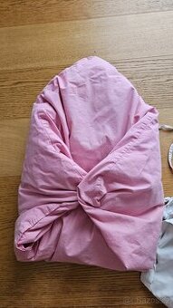 Péřová zavinovačka zn. Peří Mareš, rozměry postranní délky 60x63 cm, od cípu k cípu 80 cm. K tomu ručně šitý potah na míru, bavlněný. Cena 200 Kč. Lehká bavlněná zavinovačka postranní délky 55x60 cm, od cípu k cípu 77 cm. Cena 100 Kč. Plus poštovné