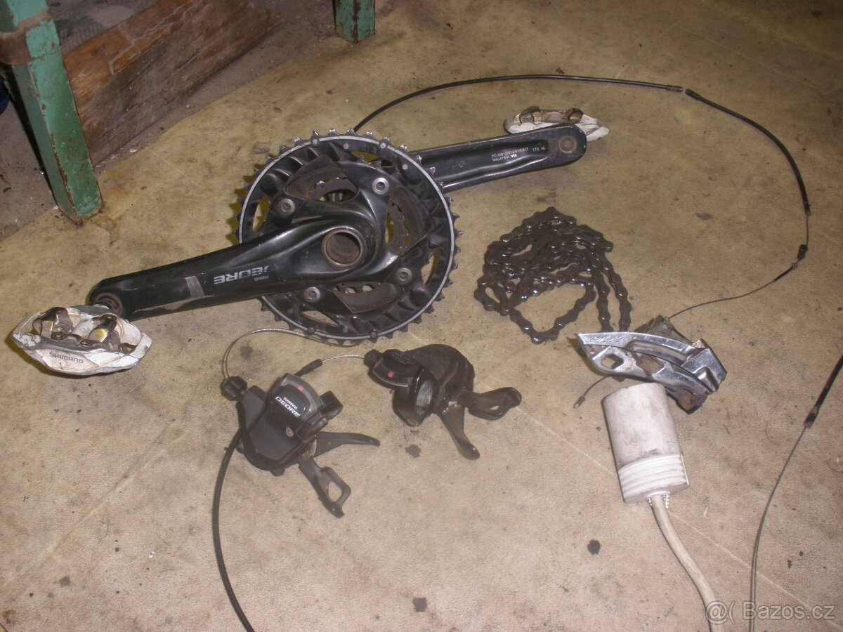 Prodám kompletní sadu Shimano 3x10. Přecházím na jiné převody. Obsahuje: Kliky Shimano Deore 175mm FC-M 610 40x30x20 Pedály Shimano PD-M 530 + kufry Kazeta Shimano 11-36 /měněno 2020/ Řetěz Sram PC1031 + rychlospojka - má najeto 100km Středové složení Shimano BB52 Přesmykač Shimano SLX-včetně lanka/bovdenu Přehazovačka Shimano SLX včetně lanka/bovdenu - provedení SGS nebo přehazovačka XT provedení SGS za příplatek Páčka L+P Shimano Deore s ukazatelem převodu /objímka/ řazení rapid fire. Cena za vše 2200kč Komponenty na fotce nejsou očištěné - kliky mají oděrky od treter, jinak stav odpovídá sezonnímu ježdění od 5/2018. info [email protected]