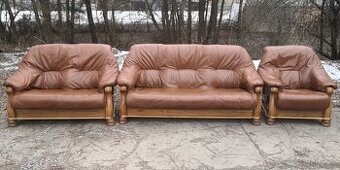 Prodám pěknou koženou sedací soupravu 3+2+1 s masivním dřevem. Rozměry: trojsedačka-190cm,dvojsedačka-140cm,křeslo-95cm,výška-95cm.