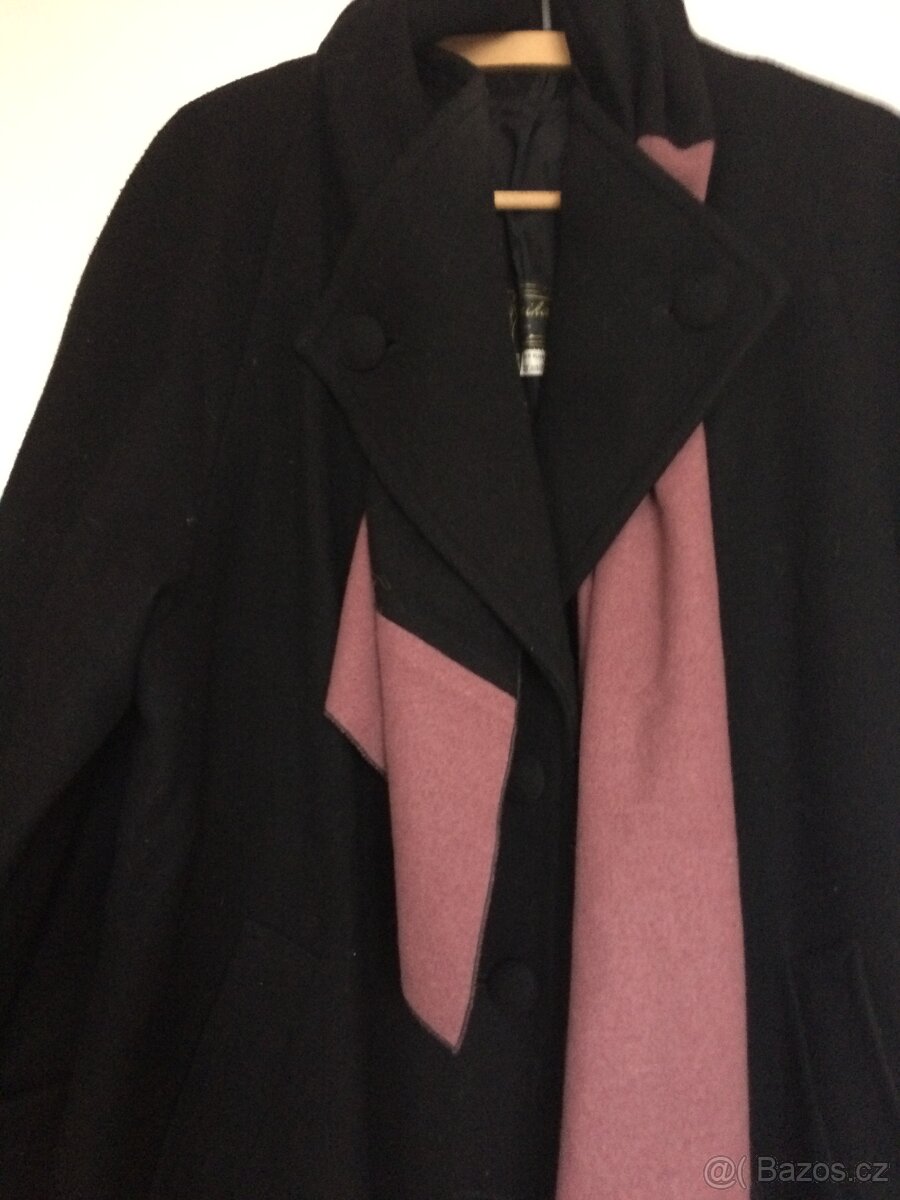 kabát dámský módní salon ERIKA Praha, černý 100% vlna, bezvadný stav,šála růžovočerná stejný materiál.Vel uvedena 38, ale kabát je velký a dlouhý,prsa 122,rukávy 64,délka 122cm.Cena + případně poštovné