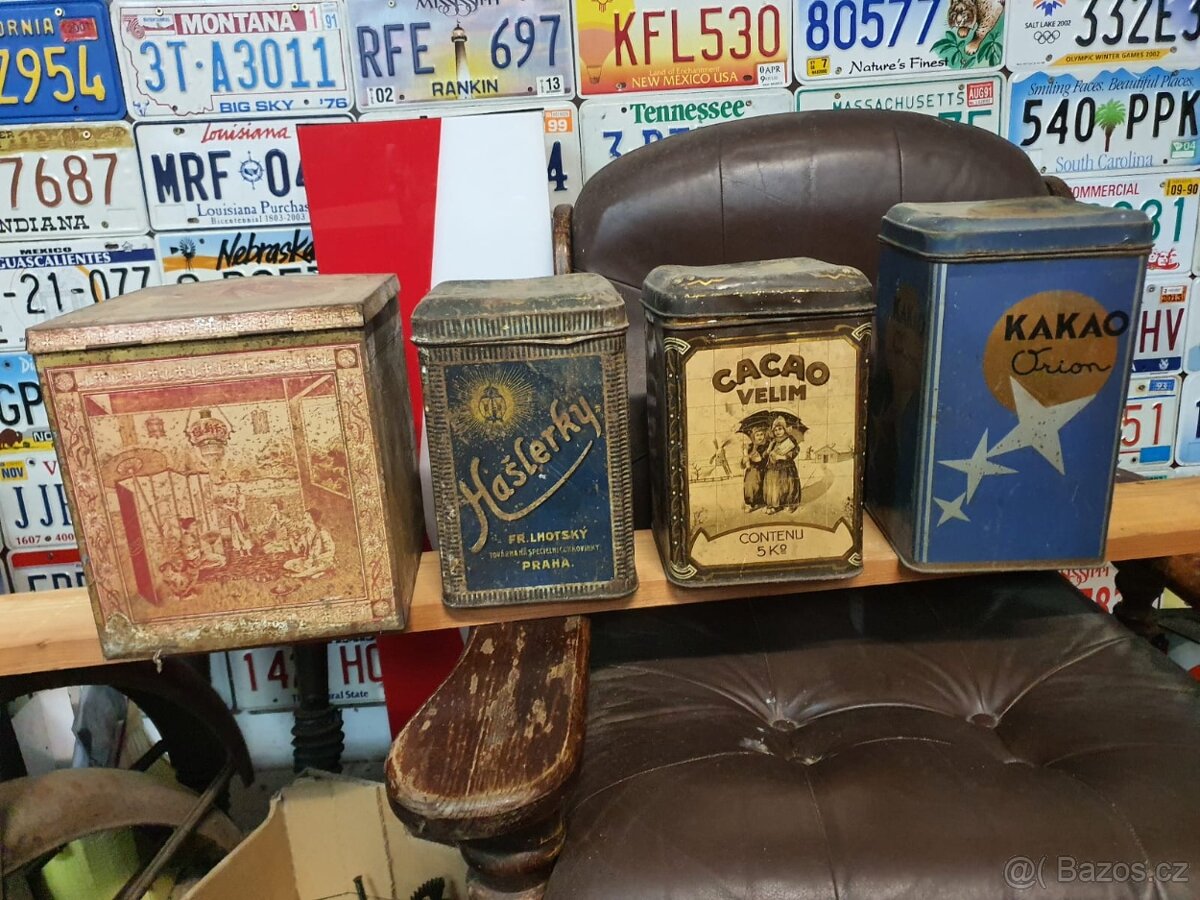 Cena: Dohodou. Prodám krásné, staré, velké plechovky, výška modré kakao 34cm, cena dohodou