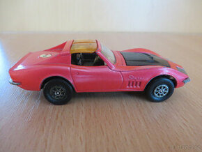 Autíčko výrobce CORGI 387 Chevrolet Corvette Stingray Coupe Model v růžové barvě, černou kapotou, výklopné světlomety, otvírací střecha, otvírání motoru.