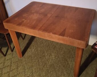 Prodám originální jídelní stůl od výrobce Tatra nábytek Pravenec, model MT 1122. Jedná se o poctivý kousek z poloviny 50. let v elegantním designu s kónickými nohami. Funkce: Stůl je rozkládací, středová deska je ukrytá uvnitř Rozměry: 115 × 80 cm (ve složeném stavu), po rozložení délka 175 cm Je ve stavu, který umožňuje ihned ho plnohodnotně používat. Povrchová úprava horní desky má přirozené známky používání, proto je stůl zároveň ideální na jednoduchou renovaci. Cena: 2000 CZK. Osobní odběr Trnava Ke stolu je možnost koupit 4 židle TON z roku 1955 (viz foto).