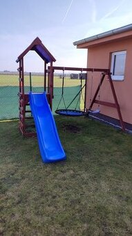 Prodám dětské hřiště se skluzavkou, hnízdem a houpačkou o rozměrech VxŠxH 260x295x331 Původně koupeno zde (natřeno barvou a doplněno o houpací hnízdo) : https://wickey.cz/hraci-vez-s-houpackou-freeflyer?sqr=Hrac%C3%AD%20v%C4%9B%C5%BE%20Wickey%20FreeFlyer