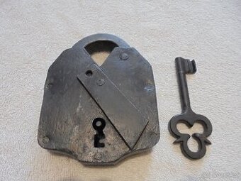Prodám starý visací zámek o rozměrech 14,2x11 cm. Klíč je doděláván dodatečně, zámek je plně funkční na dva západy.