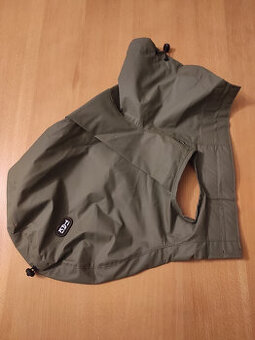 Barva: olivově zelená, délka zad cca 30 cm, vysoký stahovací límec, pohodlné nošení, podlepené švy, krytý otvor pro vodítko, vyrobeno z polyesteru a PU. Použitá 1x na 10 min.- našemu JRT je malá