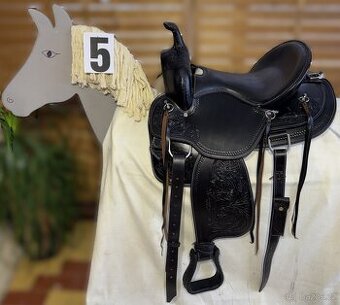 Westernové sedlo-komplet č.5) v černé barvě. Velikost sedla je Full/QH, 16" (40,5cm) i 17" (43cm) v sedu, gulett/komorou 8" (20cm). Celková délka sedla je 65cm. Sedlo je v částečné dekoraci Floral s úzkou bordurou. Černý měkký kožený sed bez prošívání. Zadní středové "Déčko" k použití podocasníku nebo uvázání zavazadla. Kvalitní a silná kůže na Fiber-glass kostře (lehké, pružné a pevné). Jednoduchý systém posouvání délky fendrových řemenů přes klasickou přezku. Součástí sedla jsou sedlové struny na přivázání bagáže nebo sedlové brašny. Sedlo je zkompletováno se: Zadními sedlovými řemeny k zadnímu podbřišníku, na levém řemenu s pouzdrem. Uzdečkou, poprsníkem a otěžemi vše v barvě i dekoraci sedla. Předním provázkovým podbřišníkem a zadním koženým podbřišníkem s propojovacím řemínkem. Cena kompletu 13.999,-Kč. Odesílám společností PPL platbou na dobírku/299,-Kč nebo platbou převodem, popř.PayPal/215,-Kč společností PPL.