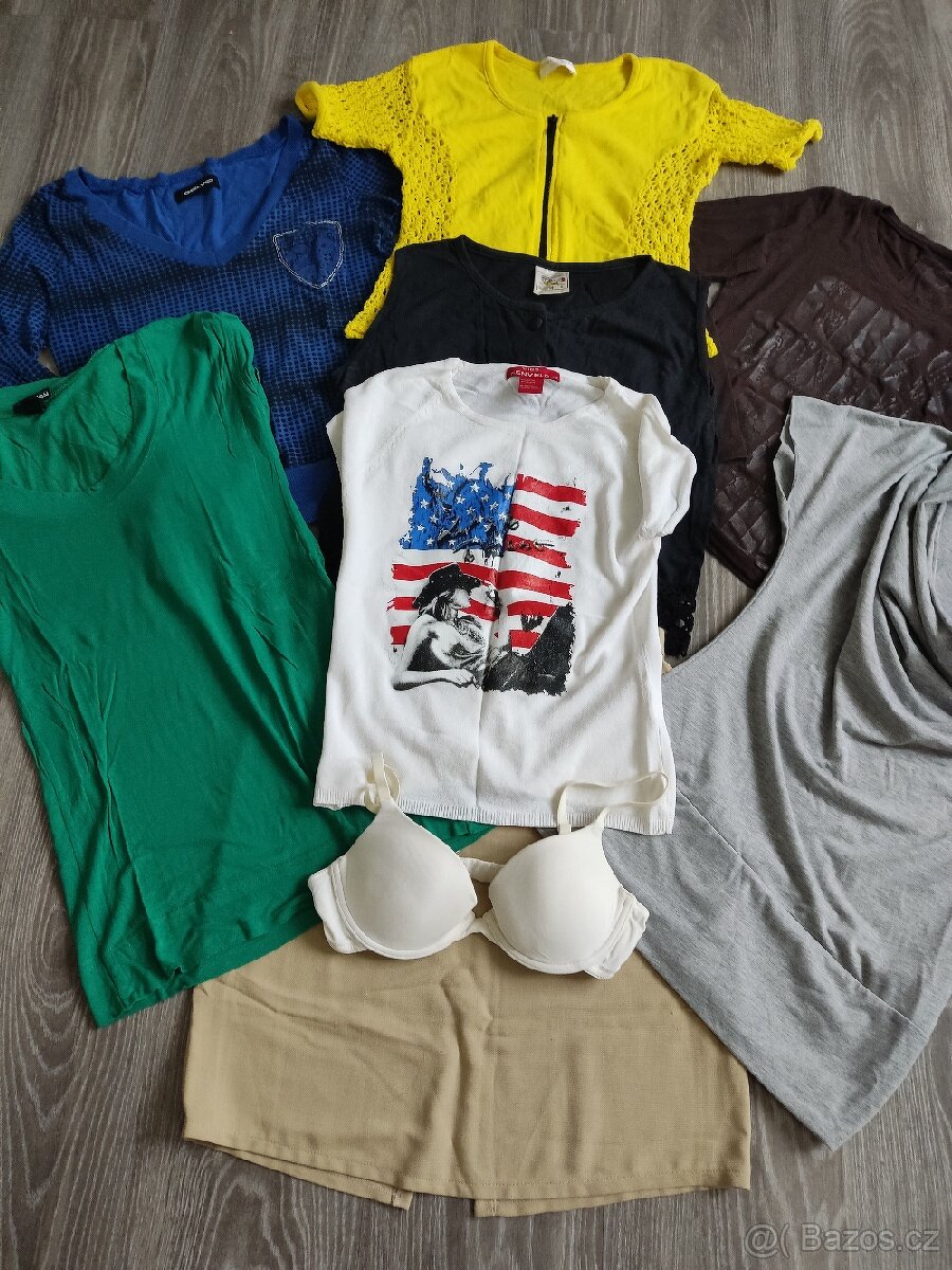 Prodám dámské oblečení ve vel.xs,s,m, trika s krátkým rukávem,s dlouhým, sukně viz foto, něco nošené víc,něco málo, zohledněno v ceně (modré triko s dlouhým rukávem má v podpaží dírky), značky H&M, Colours of the world, Kenvelo , Only, podprsenka již není součástí setu