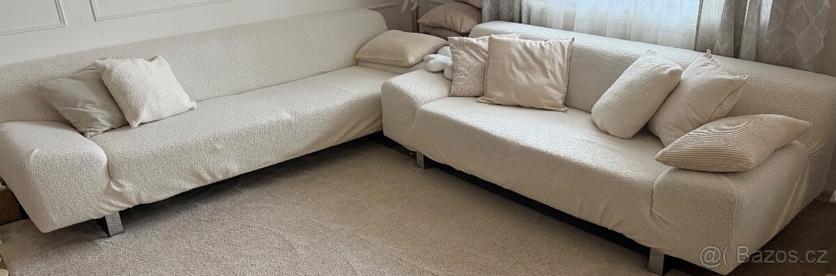 Sedací souprava se skládá ze dvou pohovek a jednoho taburetu. Větší pohovka má rozměr 240x100cm. Menší pohovka má rozměr 200x100cm. Taburet má rozměr 130x60cm. Barva béžová/šedá. Přidám i světlý beránkový potah. gauč, pohovka, sedací souprava, taburet, křeslo