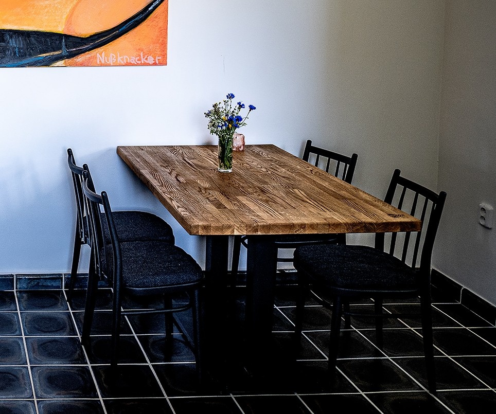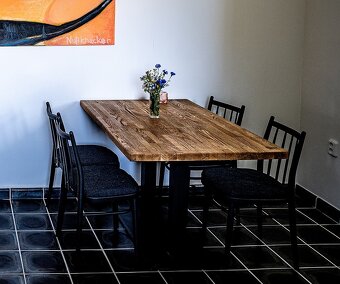 Dubový stůl z dubové spárovky. K prodeji více kusů. Elegantní a moderní styl. 🪵Rozměry: • Tloušťka: cca 4,5 cm • Délka: 125 cm • Šířka: 85 cm • Výška stolu: 80 cm 🔨Konstrukce: • Celokovové nohy (kvalitní nerez, natřený na černo, elegantní vzhled) • Drobné oděrky na spodní hraně nohou Povrchová úprava je vysoce kvalitní přírodní olej - materiál pod ním může dýchat, ale přesto výborně chrání. Luxusní kousek, ideální např. do gastro provozu, pro firemní zasedačky, showroomy nebo moderní domácnosti. Nabízíme k prodeji originální ručně vyráběné vybavení z uzavírané restaurace. Každý kus je poctivá řemeslná práce z masivního dřeva, vyrobený s důrazem na detail, odolnost a dlouhou životnost. Vše bylo používáno minimálně a je ve velmi dobrém stavu.