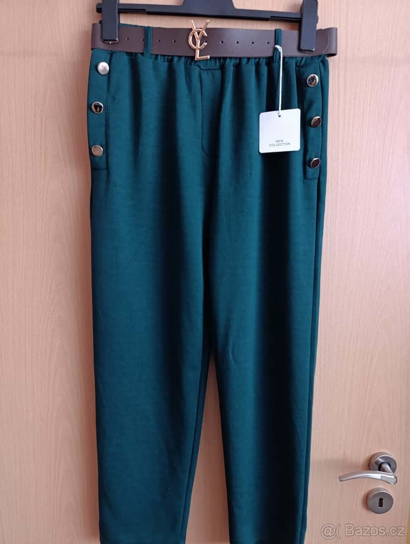 Tmavě zelené kalhoty s knoflíky a páskem, nové. Vel.L/XL, v pase 70-100 cm, boky 100-120 cm, délka 93 cm.