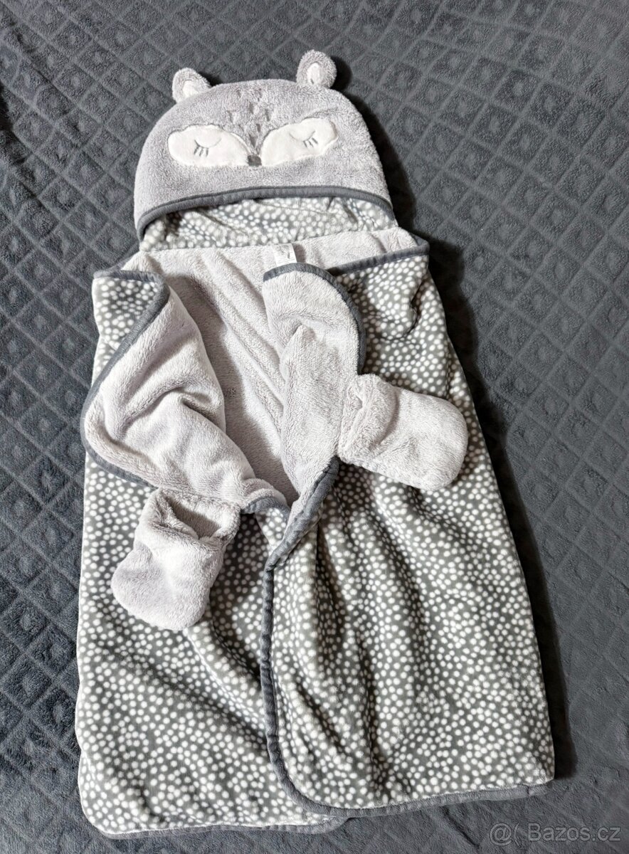 Měkoučká, heboučká, hodně teplounká, muchlovací. Super do kočárku, autosedačky i jen tak na doma k telce. Délka bez kapuce 66 cm, s kapucí 87 cm, šířka po rozložení 112 cm. Krásný stav, bez vad. Osobní odběr možný v Orlíku nad Vltavou, popř. PPL (mohu posílat denně) či Balíkovna. Zásilkovnu mám mimo dosah.