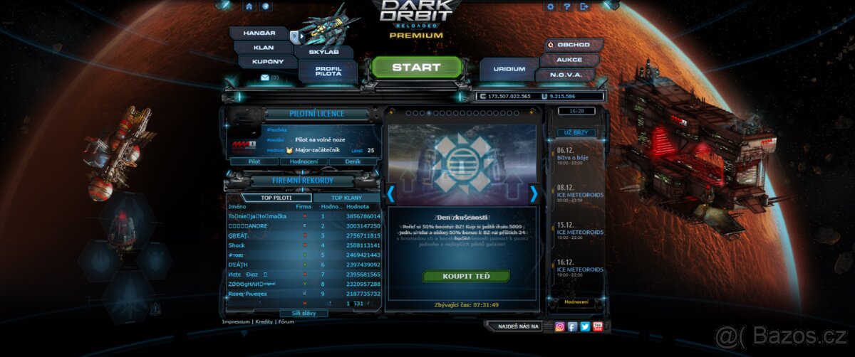 Prodám DarkOrbit účet.Lvl 25 Major-začátečník,50 Prometheus , 10 x Spartan a plno modulů.173 miliard credit a 9 200 00 uridia.Lodě Pusat Plus,Goliath plus,Citadela plus,Spearhed plus,Solaris Plus,Solaris Plus a plno kabátu na lode i letouny.Hra mi už nebaví a dlouho mi to leží .Plno věcí na PET a příprava na LF 5 výrobu, kolem 60 LF 5. Cena je pevná a preferuju osobní převzetí.Přeštice Plzenský kraj