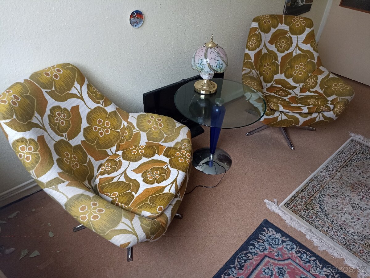 Prodam RETRO točící křesla zakoupená v 70.letech v bývalém Tuzexu. Jsou funkční. Dvě křesla za 2000,- korun