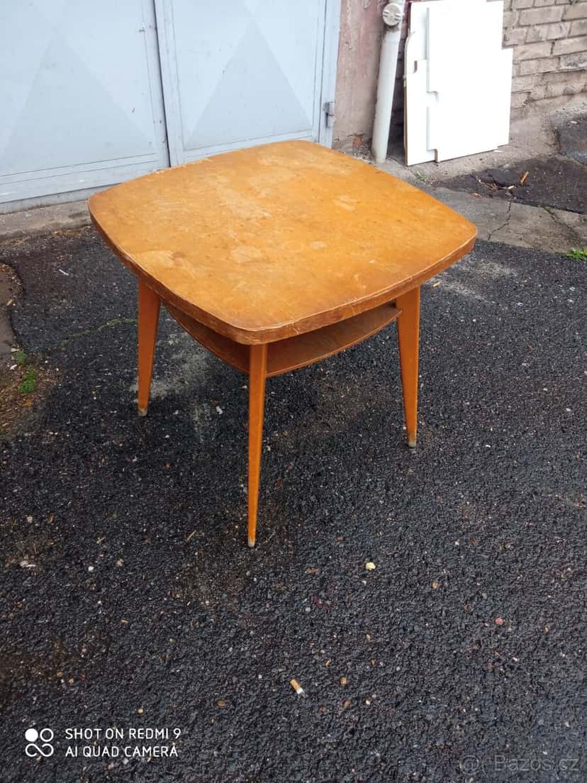 Retro stolek, výška 65cm, deska stolu cca 66x66cm, konstrukce pevná, bez červotoče, horní deska poškrábaná, uštípnutá dýha, vhodné k renovaci