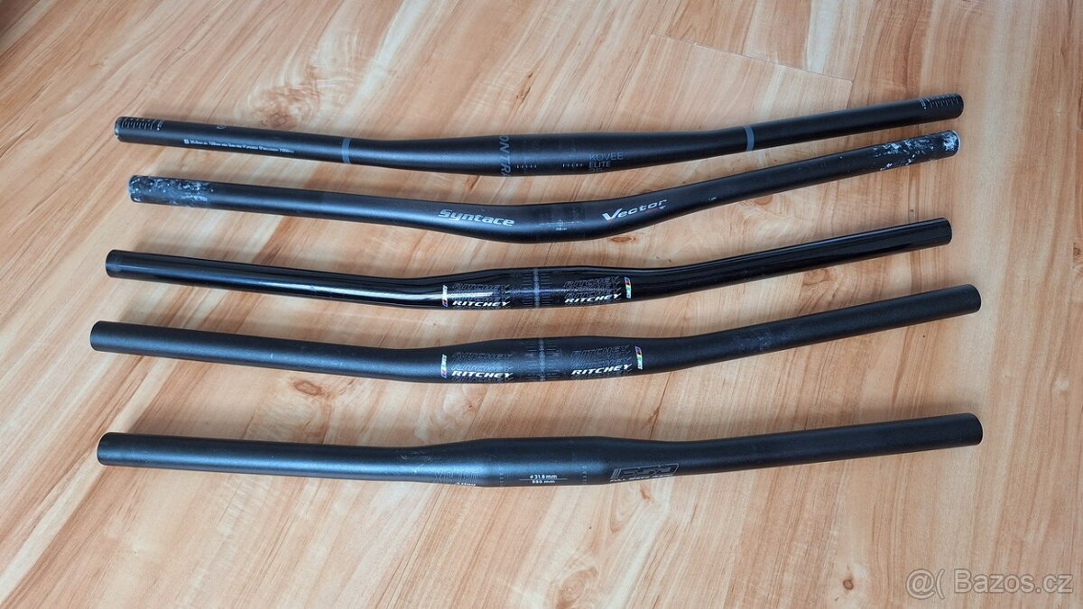 Prodám hliníková MTB řidítka: FSA XC180, průměr 31.8mm, šířka 580mm, cena kč 100,- Ritchey WCS, průměr 31,8mm, šířka 640mm, zkracována, parametry viz. foto, cena kč 390,- Ritchey WCS, průměr 31,8mm, šířka 640mm, zkracována, parametry viz foto, cena kč 390,- Syntace Vector, průměr 31,8mm, šířka 680mm, zdvih 12°(vlaškovky), cena kč 290,- Bontrager Kovee Elite, průměr 35mm, šířka 720mm, cena kč 390,- Bližší info a foto možno na mail. Po dohodě možno přiblížit po MS kraji, případně, Přerov, Valmez, Vsetín, Zlín, Uh. Hradiště.