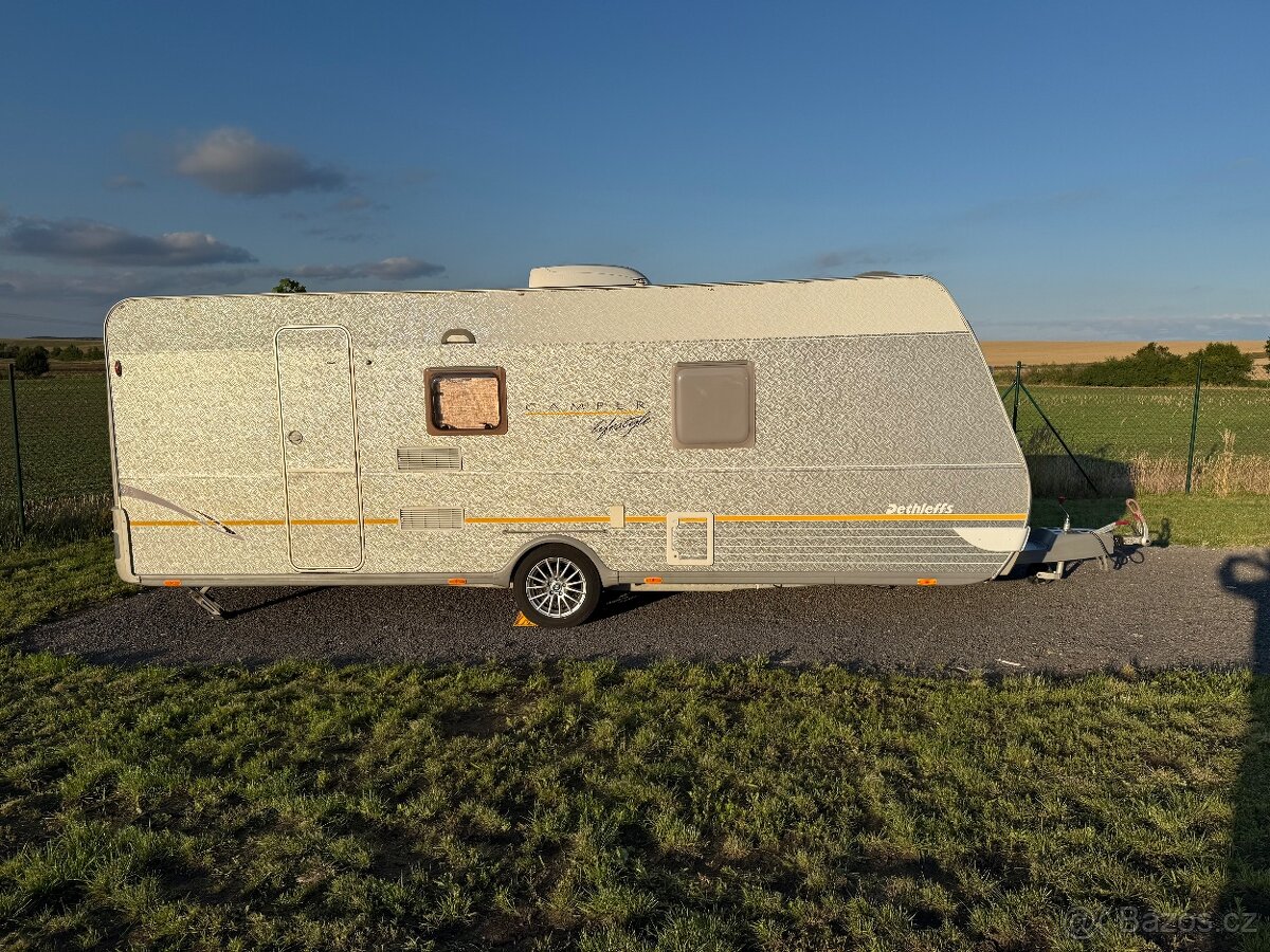 Prodám velký a prostorný karavan Dethleffs Camper 560 (nejvetsí jednoosý karavan který Ize koupit), rok 2006, karavan pro 7 osob na spaní. Celkovẽ pekný stav bez kosmetických vad. Prední i zadní cást Ize oddëlit posuvnými dvermi které hezký fungují a nejsou zkrízené. Karavan navíc vybaveny stresní klimatizací, elektrickým bojlerem, topením s rozfukem, alu koly, drzák na 4 kola a sprchovy kout. Velká francouzská postel která je prístupná nejen z boku, ale i z cela postele-velká výhoda. Hmotnost: 1310-1700 Kg Délka bez oje: 660 cm Délka s ojí: 790 cm Sirka: 250 cm PREDNÍ CÁST KARAVANU: Loznice Francouzská postel Koupelna-kazetové WC, odtoková vanicka, sprcový kout, umyvadlo, zrcadlo Moznost oddelení posuvnými dvermi STRED KARAVANU: Kuchyñ-tríplotýnkový plynový varic, drez, trojkombinovaná lednice Topeni Satni skrin Sezení s jídelním stolem Monost rozloení pro prespání dvou osob ZADNÍ CÁST KARAVANU: Palanda pro 3 osoby Palandu Ize oddelit posuvnymi dvermi Príslusenství Mnoho úloných prost