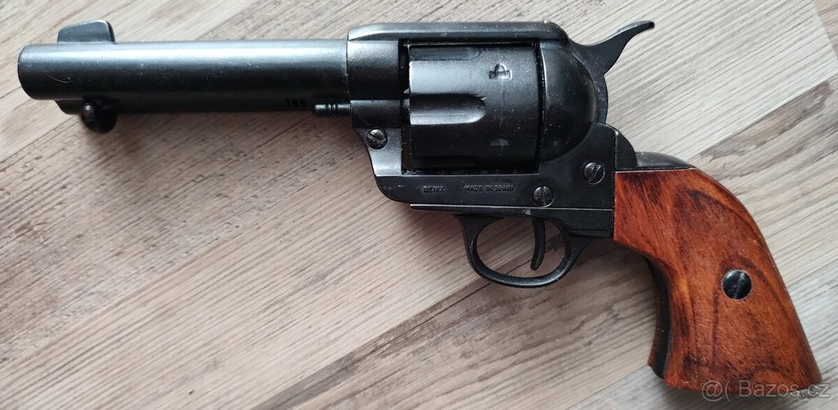 Nefunkční replika. Neschopný střelby ani po úpravě. Vyrobeno z kombinace kovu a střenek ze dřeva španělské borovice. Replika má pohyblivý ale nefunkční mechanismus. Výrobek firmy Denix, Španělsko. replika Černý Colt M 1860 armádní model, 35 cm Nutné osobní převzetí, případně dovezu: Bechyně, Tábor, Milevsko, Týn nad Vltavou. Poštou nezasílám..