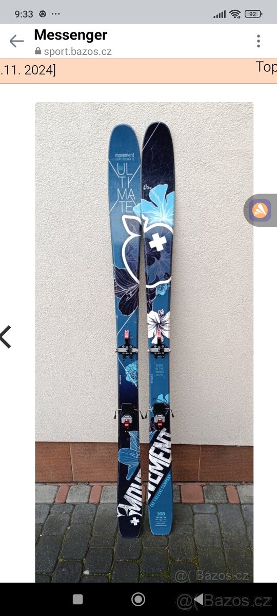 Skialpy Movement 168, pásy Colltex, vazani atk,vse v dobrém stavu. Lehké 1,15 lyže. Prodávám z důvodu, že pptrebuji kratší.