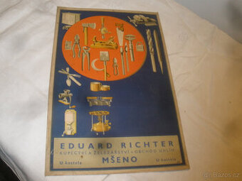 Strá reklama na kartonu,Eduard Richter,kupectví a železářství.obchod uhlím , Mšeno u kostela ,rozm.22X34.5cm,stav viz.foto.Osobní předání v okolí Mělníka nebo Kokořína.Možné poslání poštou