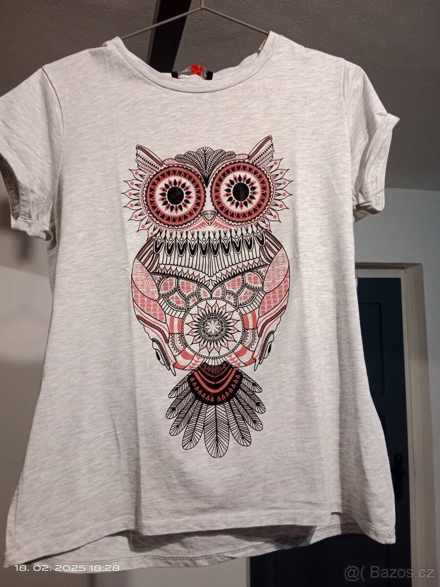 Šedé tričko s barevnou sovou. Velikost M, bavlna, polyester. FB Sister.