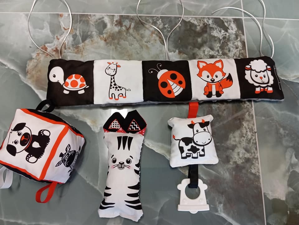 leporelo 45cm,chrastítko tygřík,kousátko kravička,kostka hrkačka,nové
