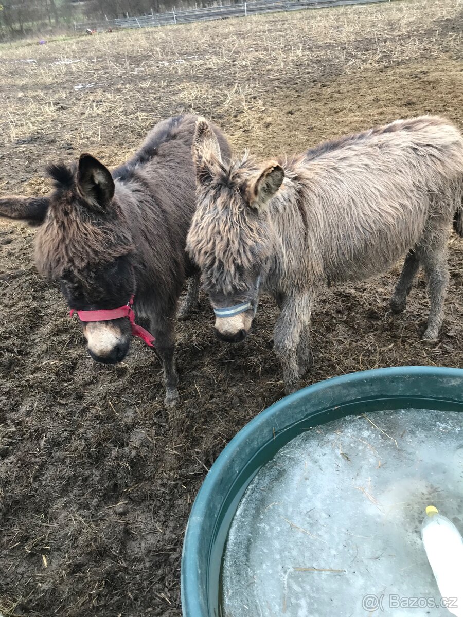 Prodám oslíka hřebeček Šedivý s černým lemováním menšího vzrůstu matka v kohoutku 95cm hodný