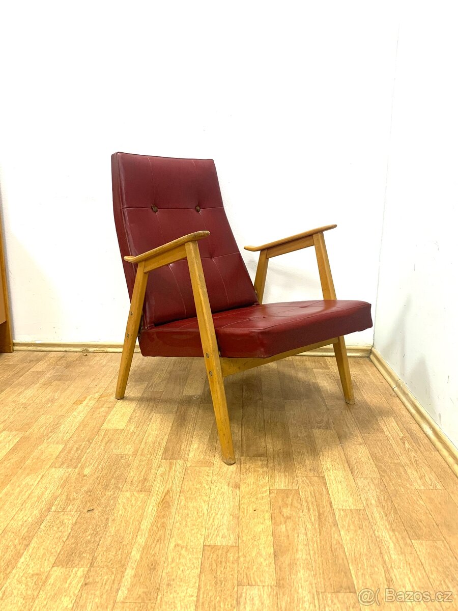 Prodávám stylové, pohodlné retro křesílko výroba ČSSR 60. léta Interiér Praha, dřevěná konstrukce, elegantně tvarované područky, sedák a opěrák čalouněný koženkou barva vínová. Křeslo ponecháno v původním, zachovalém stavu, konstrukce pevná, čalounění i lakování s drobnými oděrkami které odpovídají stáří. Cena 1400,-Kč, možnost dopravy, PŘI NÁKUPU VÍCE POLOŽEK Z MÉ NABÍDKY DOPRAVA ZDARMA ---PODÍVEJTE SE NA MÉ DALŠÍ INZERÁTY--- Tag: retro, design, expo 58, Brusel, sideboards, furniture, czechoslovakia, doplněk, solitér, vintage, skříň, skřínka, chest, nábytek, masiv, Navrátil, Jirák, dřevěný, model, starý, starodávný, mid-century, Halabala