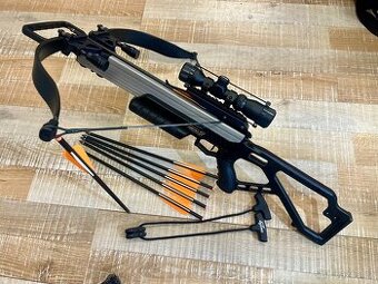 Excalibur Matrix 330 Black, osvědčený model na 3D závodech. Základem kuše je originální šedé, tvrdě eloxované tělo Excalibur. Kuše je osazena rameny Excalibur Matrix , nátahová síla je cca 210 liber, rychlost vystřeleného šípu je cca 330 fps. Dále je kuše jednou standardní pojistkou. Set obsahuje ještě 6ks carbonových šípů v délce 18" s terčovým ocelovým hrotem 100 grain a originálním natahovák Excalibur. Lučiště kuše je osazeno tlumiči tětivy a špičkovou tětivou Premium, která vyniká dlouhou životností. Optika na kuši je osvědčená Excalibur Dead Zone 4x32 s pětinásobnou osnovou umožnující střelbu na 5 různých vzdáleností, použité duralové kroužky optiky jsou rovněž Excalibur. Dále je kuše osazena stavitelnou kovovou lícnicí umožnující perfektní zamíření. Nově sestavená, se zárukou.
