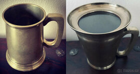 Starožitný pivový, kovový pohár so skleneným dnom