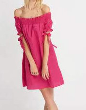 Prodám minimálně nošené šatky/tuniku značky Orsay, sytě růžové barvy, s dekoltem ve stylu carmen, velikost 34 (XS), rukávky zakončeny gumičkami a ozdobnou mašlí na zavázání,v dekoltu širší pružné gumičky. Délka od průramků (od podpaží)55,5 cm, celková délka od výstřihu 73 cm. Cena 299 Kč + poštovné, popř. zásilkovna nebo osobní předání v Poličce.